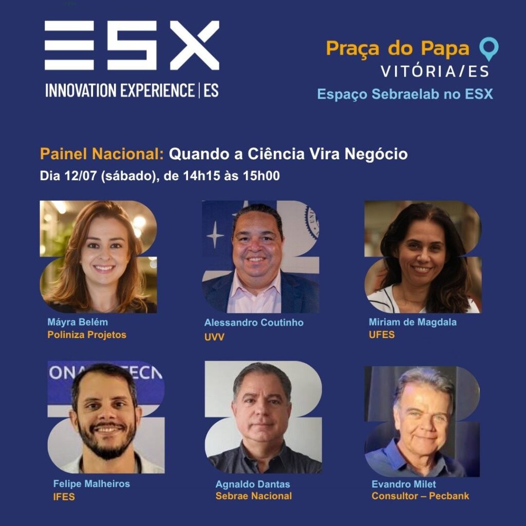 Na última edição do ESX — maior evento de inovação do Espírito Santo e um dos mais importantes do país, a Presidente da Poliniza, Máyra Belem, mediou o painel “Quando a Ciência Vira Negócio”, que reuniu representantes das universidades, Sebrae e mercado para discutir os desafios e oportunidades de transformar conhecimento científico em soluções reais para o mercado.